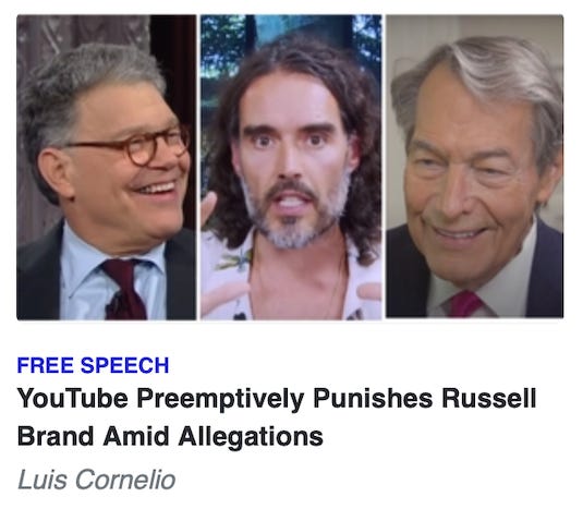 “If creators have off-platform behavior, or there’s off-platform news that could be damaging to the broader creator ecosystem, you can be suspended from our monetization program,” he claimed. YouTube demonetized Russell Brand quickly after as-yet unsubstantiated allegations of sexual assault first began to circulate in the media, allegations which Brand denies. Yet, YouTube continues to platform former CBS News journalist Charlie Rose and former Sen. Al Franken (D-MN) despite their own sexual harassment and assault allegations. Mohan’s defense thus seems hypocritical.