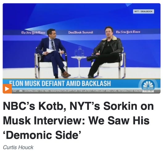 Reacting Thursday morning to Wednesday night’s bombshell Elon Musk interview at The New York Times DealBook Summit, NBC’s Today co-host Hoda Kotb and CNBC’s Squawk Box co-host Andrew Ross Sorkin, The Times columnist who interviewed Musk, described it as an illustration of Musk’s “demonic side” and “version” as Musk blasted corporations who’ve pulled advertising from X.