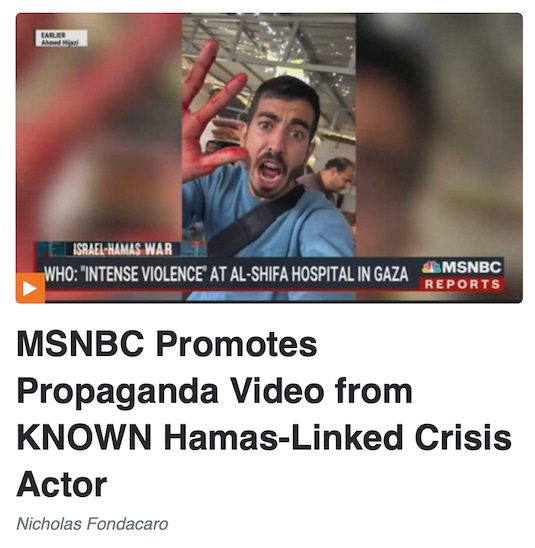 Alex Christy parroted Fondacaro’s “known crisis actor” lie in a Nov. 11 post: “Just on Friday, ABC, NBC, CBS, and MSNBC got caught using footage from a Palestinian propagandist and known crisis actor.” Curtis Houck also repeated the lie in touting a right-wing congressman spouting Fondacaro’s falsehood in a Nov. 14 post: